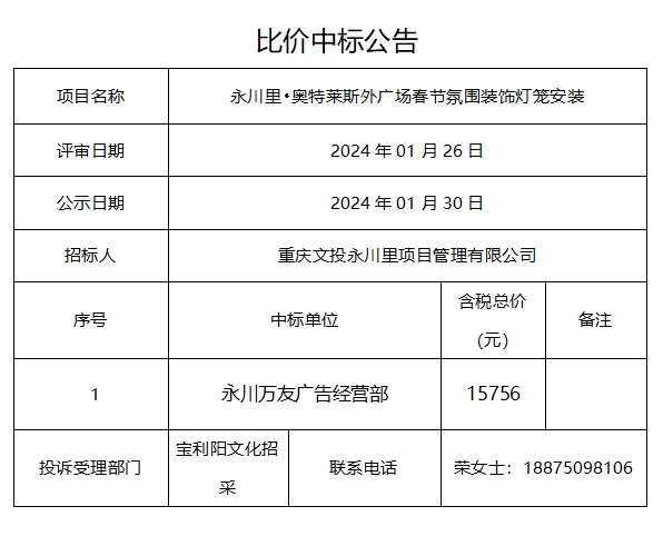 永川里•奥特莱斯外广场春节氛围装饰灯笼安装比价中标公告.docx